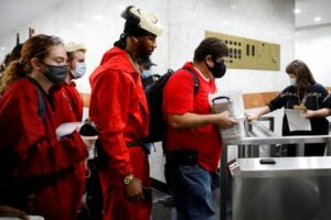 FILE PHOTO: Amazon workers arrive with paperwork to unionize at the NLRB office in Brooklyn, New York, U.S., October 25, 2021. REUTERS/Brendan McDermid