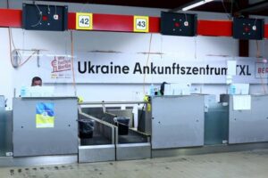 Ein Mitarbeiter sitzt an einem Schreibtisch in einem Unterbringungszentrum für Flüchtlinge, darunter auch Ukrainer, im ehemaligen Flughafen Tegel in Berlin, Deutschland, 9. November, 2022. REUTERS/Lisi Niesner