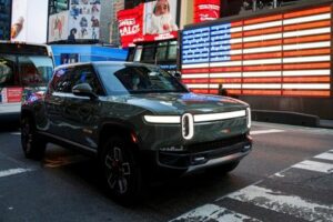 FILE PHOTO: A Rivian R1T pickup, the Amazon-backed electric vehicle (EV) maker, is driven through Times Square during the company?s IPO in New York City, U.S., November 10, 2021. REUTERS/Brendan McDermid/File Photo