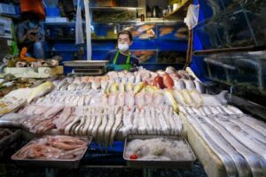 FILE PHOTO: A man works at a fish and seafood stall at a wet market following an outbreak of the coronavirus disease (COVID-19) in Beijing, China, August 14, 2020. REUTERS/Thomas Peter