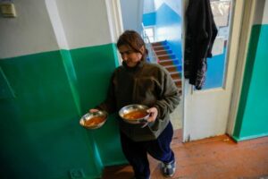 FOTO DE ARCHIVO. Yelena Bakumenko, de 34 años, civil evacuada de la ciudad salinera de Soledar en el transcurso del conflicto entre Rusia y Ucrania, lleva platos de sopa en un centro de alojamiento temporal situado en un dormitorio local en Shakhtarsk (Shakhtyorsk) en la región ucraniana de Donetsk, controlada por Rusia. 14 de enero de 2023. REUTERS/Alexander Ermochenko