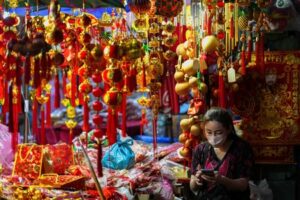 A shop owner uses her mobile phone at her stall ahead of Lunar New Year celebrations in Bangkok’s Chinatown, Thailand, January 19, 2023. REUTERS/Athit Perawongmetha