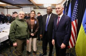El secretario de Defensa de Estados Unidos, Lloyd Austin, el ministro de Defensa de Ucrania, Oleksiy Reznikov, la ministra de Asuntos Exteriores de Islandia, Thordis Kolbrun Reykfjord Gylfadottir, y el secretario general de la OTAN, Jens Stoltenberg, se reúnen para discutir cómo ayudar a Ucrania a defenderse, en la base aérea de Ramstein, Alemania. 20 de enero de 2023. REUTERS/Wolfgang Rattay