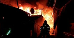 Firefighters work to put out the fire at Guryong village, the last slum in Seoul’s glitzy Gangnam district in Seoul, South Korea, January 20, 2023. South Korea’s National Fire Agency/Yonhap via REUTERS