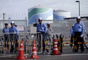 FILE PHOTO: Security personnel stand guard in front of an entrance gate of Kyushu Electric Power’s Sendai nuclear power station in Satsumasendai, Kagoshima prefecture, Japan, August 7, 2015. REUTERS/Issei Kato/File Photo