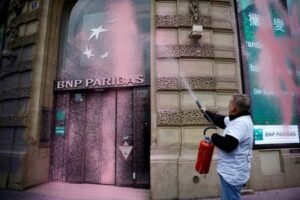 A Climate change activists from Extinction Rebellion France sprays paint on a BNP Paribas bank building during a protest against TotalEnergies and the East African Crude Oil Pipeline (EACOP) project, in Paris, France, January 20, 2023. REUTERS/Sarah Meyssonnier