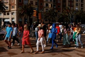 FILE PHOTO: People walk as they prepare to be extras for an Dutch advertising spot of fruit-flavoured beverages in central Malaga, Spain, April 28, 2022. REUTERS/Jon Nazca