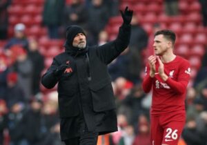 Soccer Football – Premier League – Liverpool v Chelsea – Anfield, Liverpool, Britain – January 21, 2023 Liverpool manager Juergen Klopp and Andrew Robertson after the match REUTERS/Phil Noble