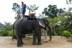 A mahout adjusts a chair on top of an elephant while they wait for tourists in a jungle park on the eve of Lunar New Year in Phuket, Thailand January 21, 2023. REUTERS/Jorge Silva