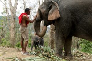 Elephant owner Wittaya Taweeros inspects two of his newly purchased elephants, which are to be used for tourist rides in a jungle park, ahead of Lunar New Year in Phuket, Thailand January 20, 2023. REUTERS/Jorge Silva