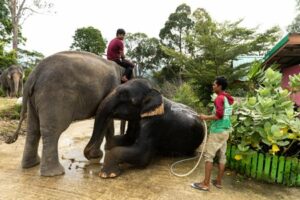 Mahouts bathe elephants while they wait for tourists in a jungle park on the eve of the Lunar New Year in Phuket, Thailand January 21, 2023. REUTERS/Jorge Silva