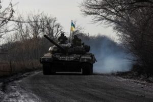 Ukrainian servicemen ride atop a tank near the frontline town of Bakhmut, amid Russia’s attack on Ukraine, in Donetsk region, Ukraine January 20, 2023. REUTERS/Oleksandr Ratushniak