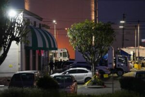 A crime scene clean up crew enters the scene of a shooting that took place at Star Dance Studio during a Chinese Lunar New Year celebration, in Monterey Park, California, U.S. January 22, 2023. REUTERS/Allison Dinner
