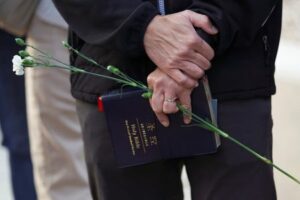A man holds flowers and a bible as members of the community hold a prayer vigil near the scene of a shooting that took place during a Chinese Lunar New Year celebration, in Monterey Park, California, U.S. January 22, 2023. REUTERS/Allison Dinner