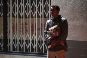 A man holds flowers near the scene of a shooting that took place during a Chinese Lunar New Year celebration, in Monterey Park, California, U.S. January 22, 2023. REUTERS/Allison Dinner