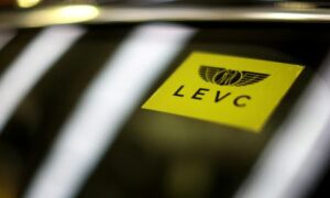 An LEVC (London Electric Vehicle Company) company logo is seen