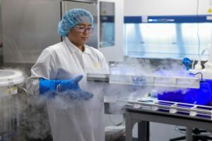 A lab employee removes a tray containing viles of frozen chicken cells from a freezer in the seed lab at the UPSIDE Foods plant, where lab-grown meat is cultivated, in Emeryville, California, U.S. January 11, 2023. REUTERS/Peter DaSilva