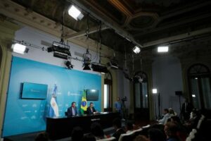 El ministro de Economía de Argentina, Sergio Massa, y su par de Brasil, Fernando Haddad, responden preguntas durante una conferencia de prensa en la Casa Rosada en Buenos Aires, Argentina. 23 ene, 2023. REUTERS/Agustin Marcarian