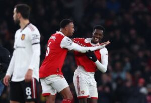 Soccer Football – Premier League – Arsenal v Manchester United – Emirates Stadium, London, Britain – January 22, 2023 Arsenal’s Gabriel and Eddie Nketiah celebrate after the match REUTERS/David Klein