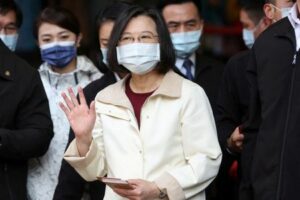 FILE PHOTO: Taiwan President Tsai Ing-wen waves to people while visiting a temple on the first day of the Lunar New Year in Taipei, Taiwan January 22, 2023. REUTERS/Carlos Garcia Rawlins/File Photo