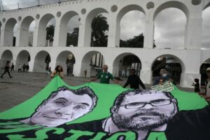 FILE PHOTO: Demonstrators hold a banner with the images of British journalist Dom Phillips and Brazilian Indigenous affairs specialist Bruno Pereira, both killed in the Amazon, during a protest in the Arcos da Lapa (Lapa Arches) in Rio de Janeiro Brazil 26, 2022. REUTERS/Pilar Olivares/File Photo