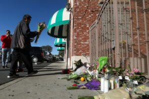 A man lays flowers at the entrance of the Star Ballroom Dance Studio after a mass shooting during Chinese Lunar New Year celebrations in Monterey Park, California, U.S. January 23, 2023. REUTERS/David Swanson