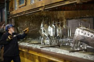A worker removes pieces of metal from the galvanising bath inside the factory of Corbetts The Galvanizers in Telford, Britain, June 28, 2022. REUTERS/Phil Noble