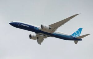 FILE PHOTO: A Boeing 777X aircraft during a display at the Farnborough International Airshow, in Farnborough, Britain, July 20, 2022. REUTERS/Peter Cziborra