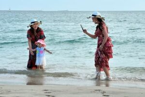 A woman poses for pictures with a child at a beach during the Spring Festival and Lunar New Year holiday in Sanya, Hainan province, China January 23, 2023. REUTERS/Alessandro Diviggiano
