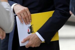 Claudio Descalzi, CEO of Italian energy company Eni holds a folder with the logo of Eni at the Presidential Palace in Nicosia, Cyprus April 25, 2018. REUTERS/Yiannis Kourtoglou
