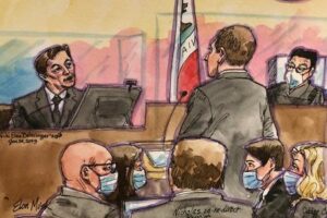 Tesla CEO Elon Musk is questioned on re-direct by the investors’ attorney Nicholas Porritt before Judge Edward Chen, during a securities-fraud trial at federal court in San Francisco, California, U.S., January 24, 2023 in this courtroom sketch. REUTERS/Vicki Behringer