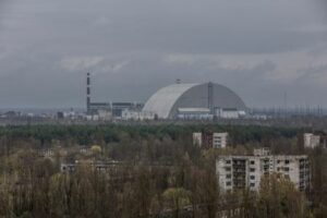 FILE PHOTO: A general view of the New Safe Confinement (NSC) structure over the old sarcophagus covering the damaged fourth reactor at the Chornobyl Nuclear Power Plant, in Chornobyl, Ukraine April 26, 2022. REUTERS/Oleksandr Ratushniak
