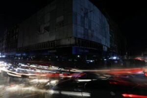 Vehicle lights cause light streaks on the road along a market, during country-wide power breakdown in Karachi, Pakistan January 23, 2023. REUTERS/Akhtar Soomro
