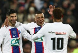 Los jugadores del Paris St Germain Carlos Soler, Kylian Mbappé y Neymar (de izq a dcha) celebran tras marcar el sexto gol ante el Pays de Cassel en dieciseisavos de final de la Copa de Francia en el Stade Bollaert-Delelis, Lens, Francia. 23 enero 2023. REUTERS/Yves Herman