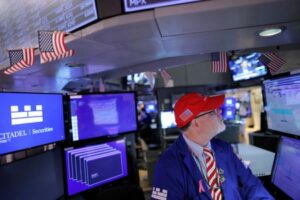 FILE PHOTO: A trader works on the trading floor at the New York Stock Exchange (NYSE) in Manhattan, New York City, U.S., November 11, 2022. REUTERS/Andrew Kelly/File Photo