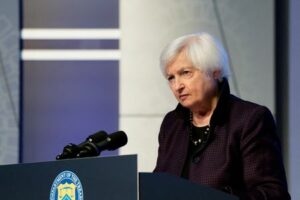 FILE PHOTO: U.S. Treasury Secretary Janet Yellen listens to a reporter’s question at a news conference during the Annual Meetings of the International Monetary Fund and World Bank in Washington, U.S., October 14, 2022. REUTERS/Elizabeth Frantz/File Photo