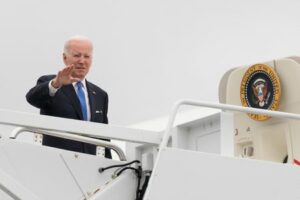 U.S. President Joe Biden waves as he boards Air Force One for return travel to Washington, at Dover Air Force Base in Dover, Delaware, U.S., January 23, 2023. REUTERS/Ken Cedeno