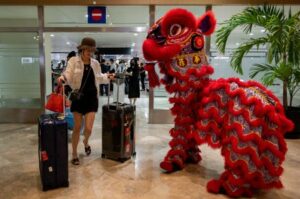 A dragon dance performer greets a traveler from China at the Ninoy Aquino International Airport, in Pasay City, Metro Manila, Philippines, January 24, 2023. REUTERS/Lisa Marie David