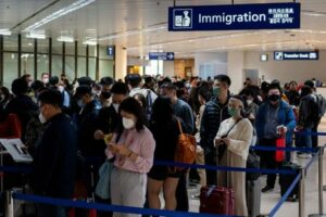 Travelers from China line up at the immigration at the Ninoy Aquino International Airport, in Pasay City, Metro Manila, Philippines, January 24, 2023. REUTERS/Lisa Marie David