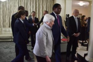 Zambian President Hakainde Hichilema leads U.S. Treasury Secretary Janet Yellen into State House during Yellen’s visit in Lusaka, Zambia, January 23, 2023. REUTERS/Namukolo Siyumbwa
