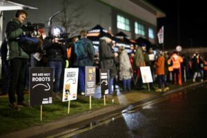 A view of signs as people gather during a rally outside the Amazon warehouse, in Coventry, Britain, January 25, 2023. REUTERS/Henry Nicholls