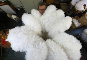 Louis Kersten, 82, artisan and renter of costumes for “Gilles of Binche” adjusts an ostrich feather hat in his workshop that will be worn by a performer during the Binche carnival, a UNESCO World Heritage event, in Binche, Belgium January 24, 2023. REUTERS/Yves Herman