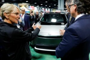U.S. Energy Secretary Jennifer Granholm views an electric Toyota bZ4X on a visit to the Washington Auto Show in Washington, U.S. January 25, 2023. REUTERS/Jonathan Ernst
