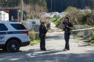 San Mateo Sheriffs protect the police line at one of the crime scenes, the day after a mass shooting at two locations in the coastal city of Half Moon Bay, California, U.S., January 24, 2023. REUTERS/Laure Andrillon