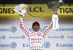 Foto de archivo. El ciclista colombiano Nairo Quintana celebra en el podio con la camiseta de premios de montaña tras la novena etapa del Tour de Francia, en Cluses a Tignes, Francia, 4 de julio, 2021. REUTERS/Benoit Tessier