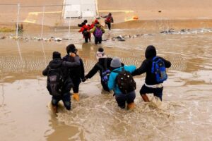 Foto de un grupo de inmigrantes cruzando el Rio Bravo, la frontera entre EEUU y Mexico