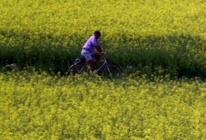 FILE PHOTO: A man rides a bicycle through a rapeseed field in Unterfoehring, Germany, May 11, 2011. REUTERS/Michael Dalder/File Photo
