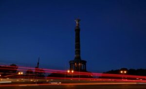FILE PHOTO: Cars make their way past the Victory Column shows a reduced lighting to save energy due to Russia’s invasion of Ukraine in Berlin, Germany August 6, 2022. REUTERS/Lisi Niesner/File Photo