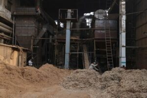 FILE PHOTO: A labourer loads sugarcane based biomass on to a boiler to generate steam, at a dyeing unit in Panipat, India, December 21, 2022. REUTERS/Anushree Fadnavis