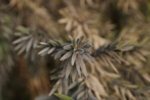 FILE PHOTO: Biomass ash, the residue left after combustion, is seen on the leaves of a plant near dyeing units, in Panipat, India, December 21, 2022. REUTERS/Anushree Fadnavis